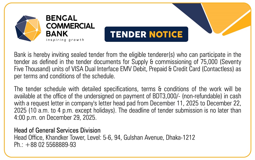 RFQ for Supply & commissioning of 30,000 (Thirty Thousand) units of VISA Dual Interface EMV Debit, Prepaid & Credit Card (Contactless) for Bengal Commercial Bank Ltd. (BGCB). |